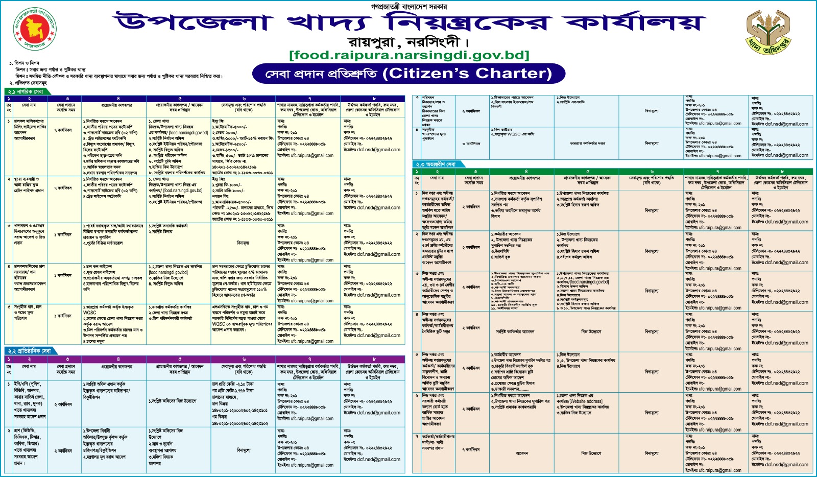 | ১। | খাদ্য ব্যবস্থাপনা বিষয়ক তথ্য সরবরাহ | ০৭ (সাত) কর্মদিবস | ১) নির্ধারিত ফরমে আবেদন। ২) চাহিত তথ্যের বিষয়ে সুষ্ঠুভাবে উল্লেখ। | উপজেলা খাদ্য নিয়ন্ত্রকের কার্যালয়, রায়পুরা ও তথ্য কমিশনের ওয়েবসাইট। | মূদ্রিত কপির ক্ষেত্রে নির্ধারিত মূল্য এবং মূল্য নির্ধারিত নয় এরূপক্ষেত্রে প্রতি পৃষ্ঠার জন্য ০২ (দুই) টাকা (ফটোকপির জন্য) হিসেবে প্রদেয়। | খাদ্য পরিদর্শক, রায়পুরা, নরসিংদী । ফোনঃ০২-৯৪৪৮০৫৯ | উপজেলা খাদ্য নিয়ন্ত্রক, রায়পুরা, নরসিংদী । ফোনঃ০২-৯৪৪৮০৫৯ |